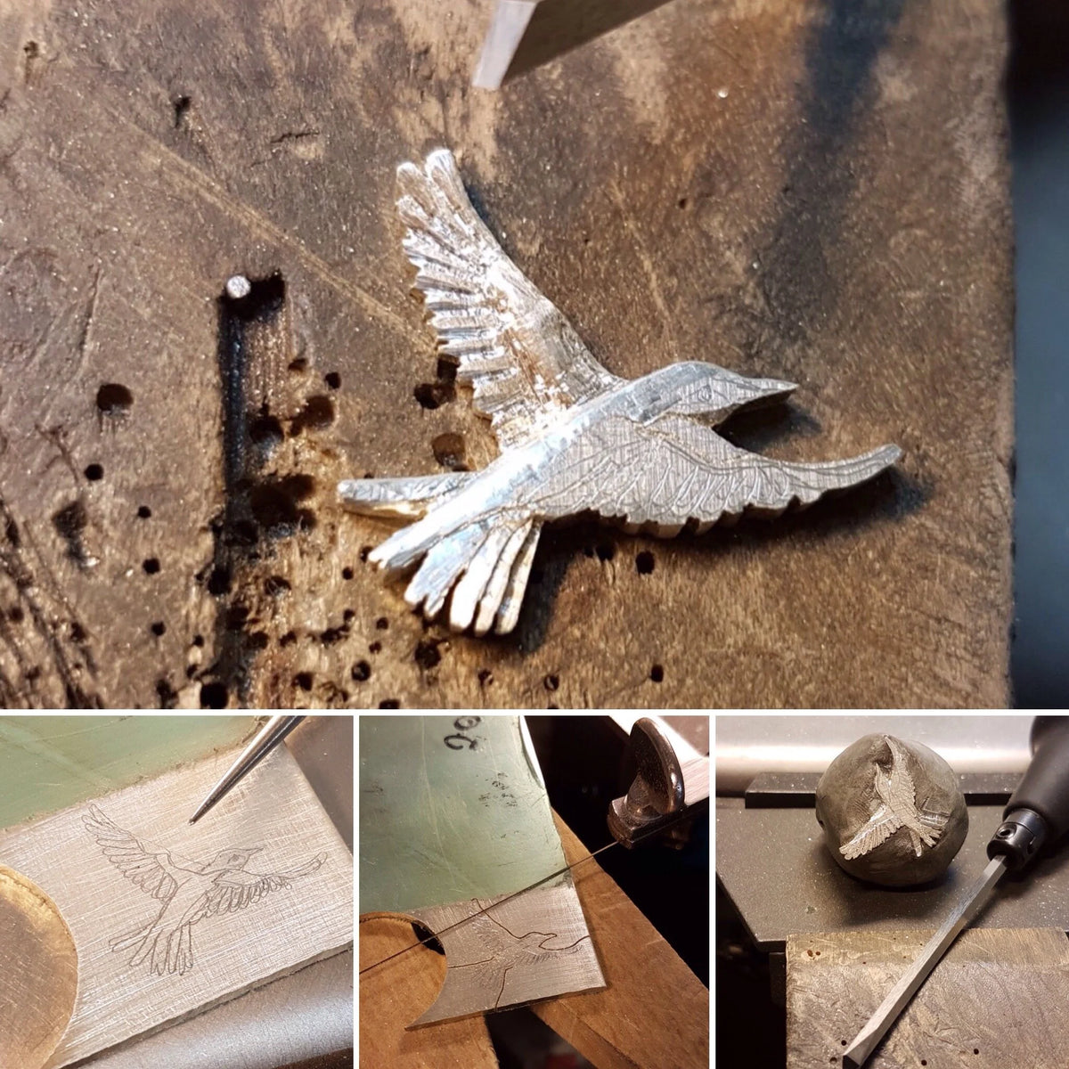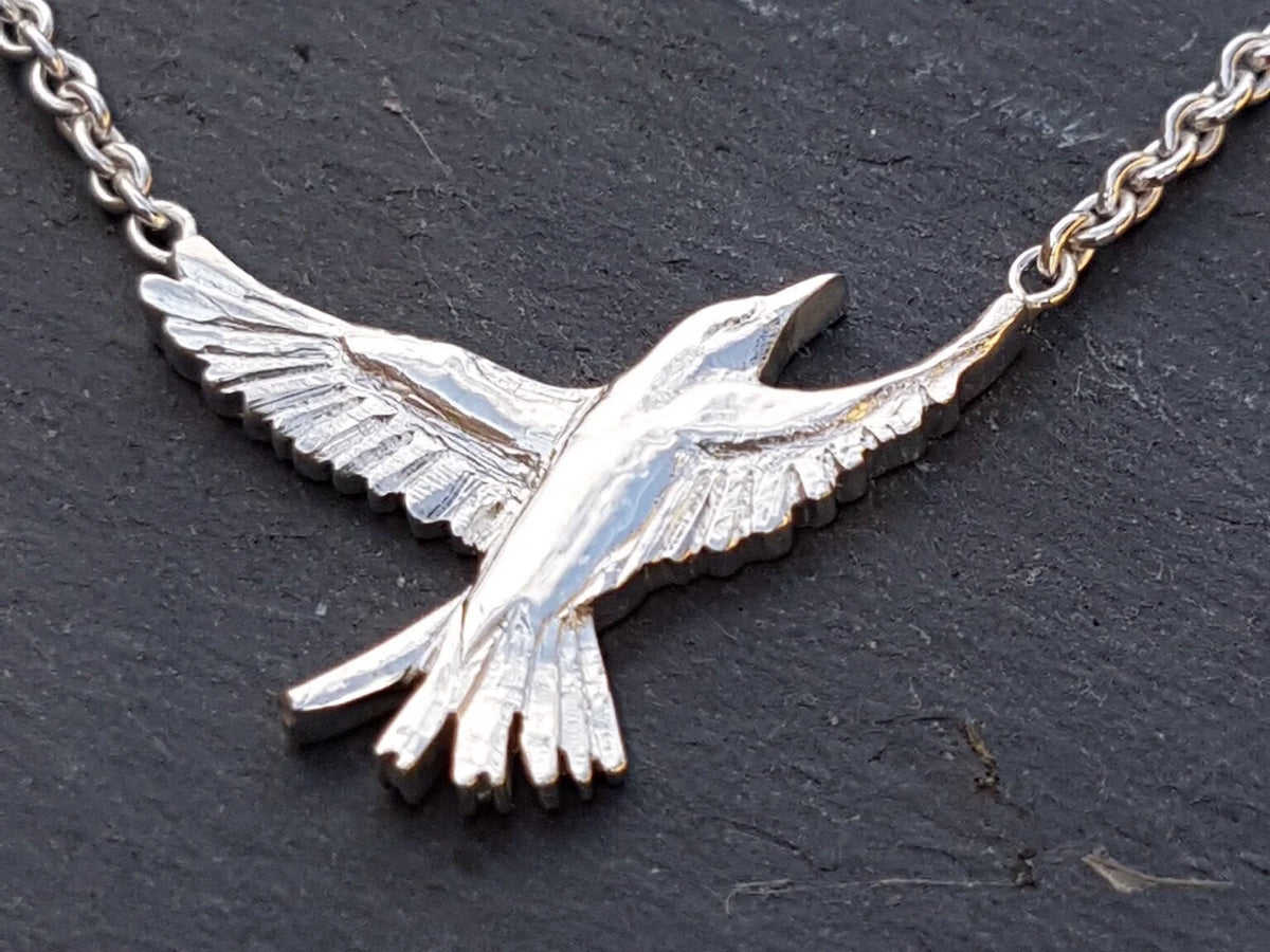 Resultatet blev denne helt unikke håndlavede halskæde. Fuglens motiv blev overført på en kraftig sølvplade, der efterfølgende blev savet ud. Den næstes proces var at forme fuglen direkte ud af pladen. Dette blev gjort ved at fjerne sølvmateriale med stikler og med fræser.